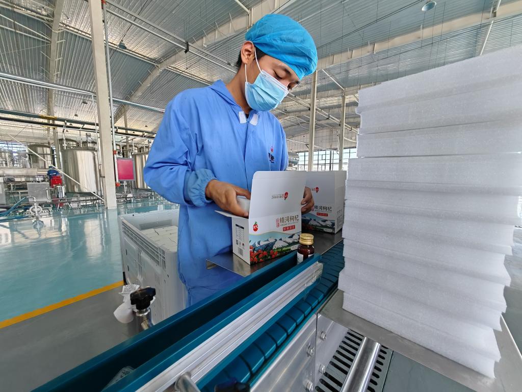 9月21日,精河縣杞瑞生物科技有限責(zé)任公司生產(chǎn)車間,工人們加班加點(diǎn)包裝產(chǎn)品。新華社記者 茍立鋒 攝