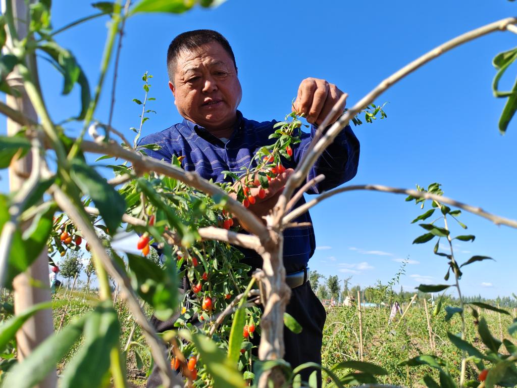 9月21日,精河縣托里鎮(zhèn)吾夏克巴依西村杞農(nóng)查看枸杞生長情況。新華社記者 茍立鋒 攝