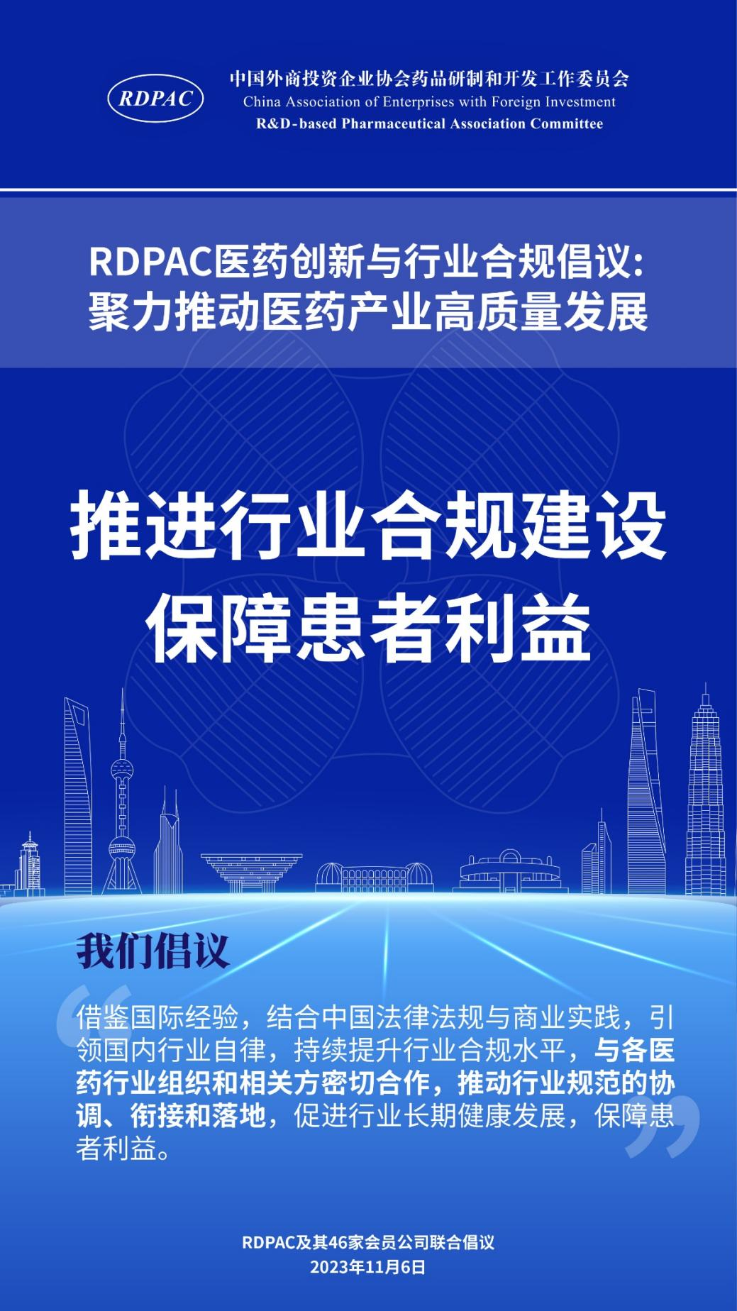 11月6日,中國(guó)外商投資企業(yè)協(xié)會(huì)藥品研制和開(kāi)發(fā)工作委員會(huì) (以下簡(jiǎn)稱 “RDPAC”)及其成員公司在華負(fù)責(zé)人共同發(fā)起“RDPAC醫(yī)藥創(chuàng)新與行業(yè)合規(guī)倡議”,致力于打造充滿活力的醫(yī)藥創(chuàng)新生態(tài)系統(tǒng)、完善的行業(yè)合規(guī)體系,聚力推動(dòng)中國(guó)醫(yī)藥產(chǎn)業(yè)的高質(zhì)量發(fā)展,建設(shè)健康中國(guó)。