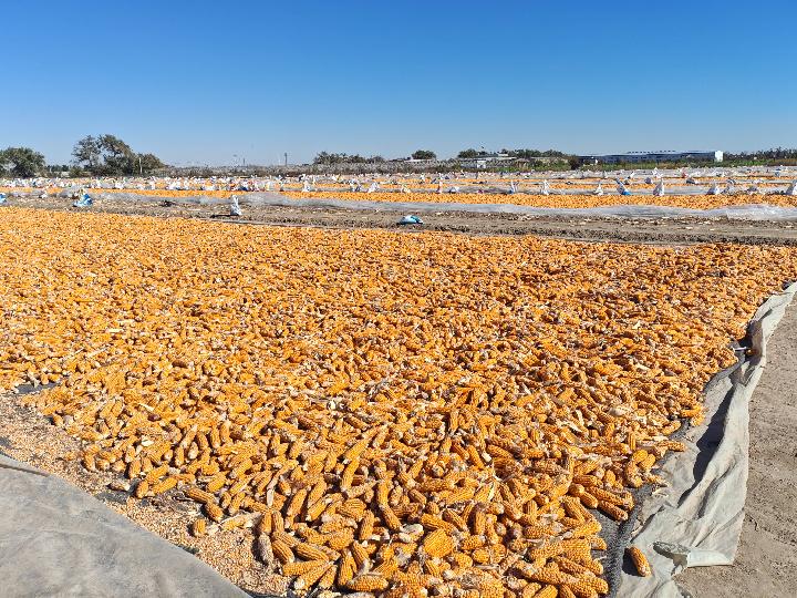 新疆昌吉回族自治州奇臺(tái)縣晾曬場(chǎng)上等待脫粒交售的玉米。新華社記者茍立鋒 攝