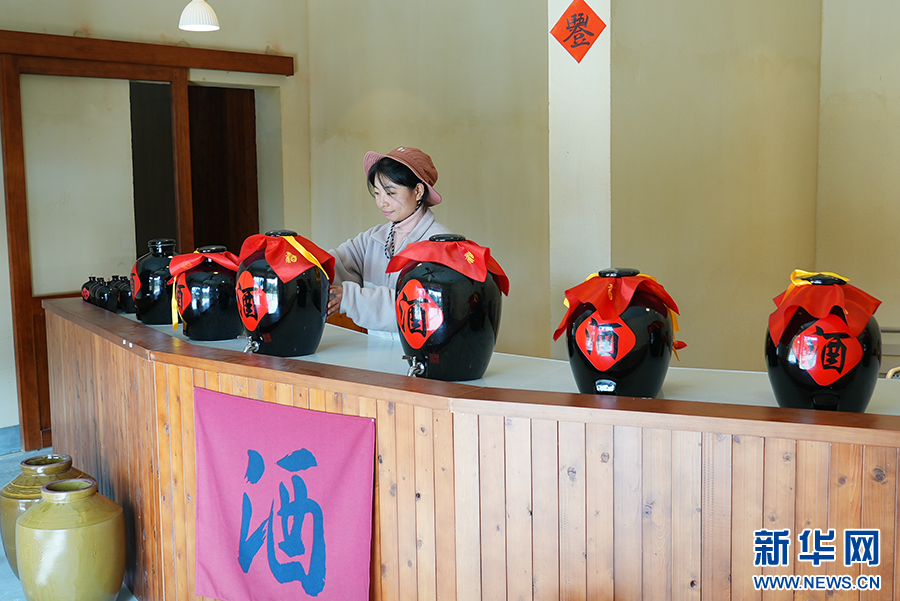 冬日,在石泉縣城關(guān)鎮(zhèn)絲銀壩村草池灣米酒工坊,工作人員整理柜臺(tái)。新華網(wǎng) 楊喜龍 攝