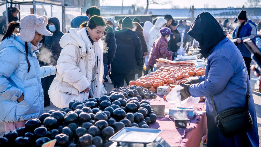 “凍梨凍柿子嘞,嘎嘎甜,不甜不要錢”“冰糖心蘋果賤賣嘍,3斤10塊”“排骨18塊1斤,棒骨8塊1斤”……臨近年關(guān),吉林省長春市近郊的卡倫大集上,人群摩肩接踵,叫賣聲此起彼伏。這個(gè)中國東北農(nóng)村集市年味漸濃。