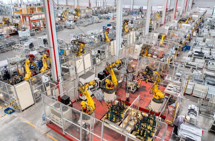 2024年1月8日,在位于浙江省湖州市長(zhǎng)興經(jīng)濟(jì)技術(shù)開發(fā)區(qū)的長(zhǎng)興地通汽車部件有限公司,全自動(dòng)機(jī)器人高速運(yùn)轉(zhuǎn)生產(chǎn)新能源汽車配件訂單產(chǎn)品(無人機(jī)照片)。新華社發(fā)(譚云俸攝)